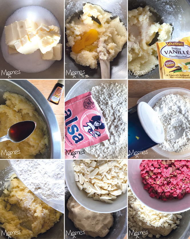 Recette Cookies Praline Rose Et Chocolat Blanc. Mettre le beurre ramolli (pas fondu complètement) dans une jatte. Rajouté le chocolat blanc et la praline (gardez en un peu pour la déco des cookies).